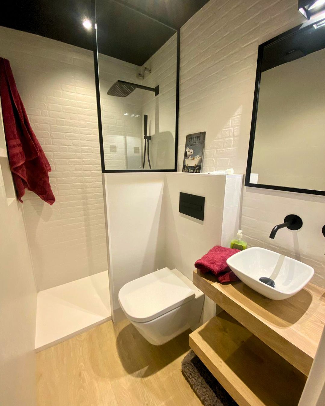 En esta reforma de baño, fusionamos la impactante intensidad del techo negro con las paredes revestidas de azulejos blancos. La inclusión de mobiliario de madera agrega una agradable sensación de calidez al espacio.