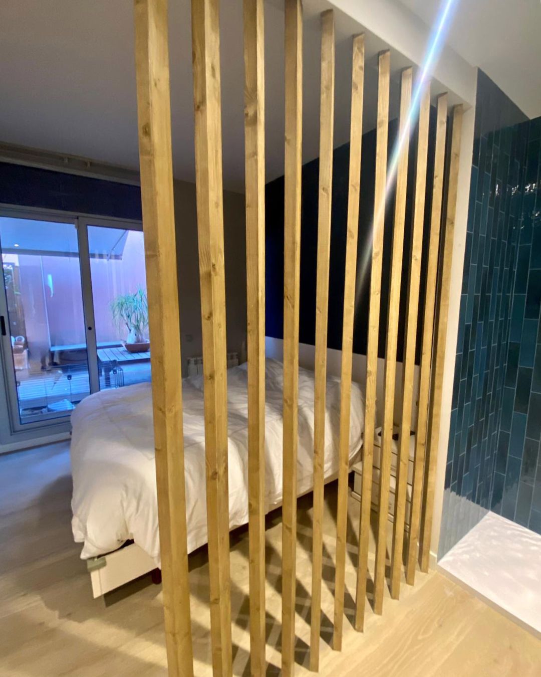 Un ejemplo claro es el uso de listones de madera reciclados como divisoria, visibles en la foto de la reforma de baño que realizamos a uno de nuestros clientes. Estos no solo aportan un toque estético único, sino también promueven la reutilización de recursos naturales y reducen la huella ambiental.