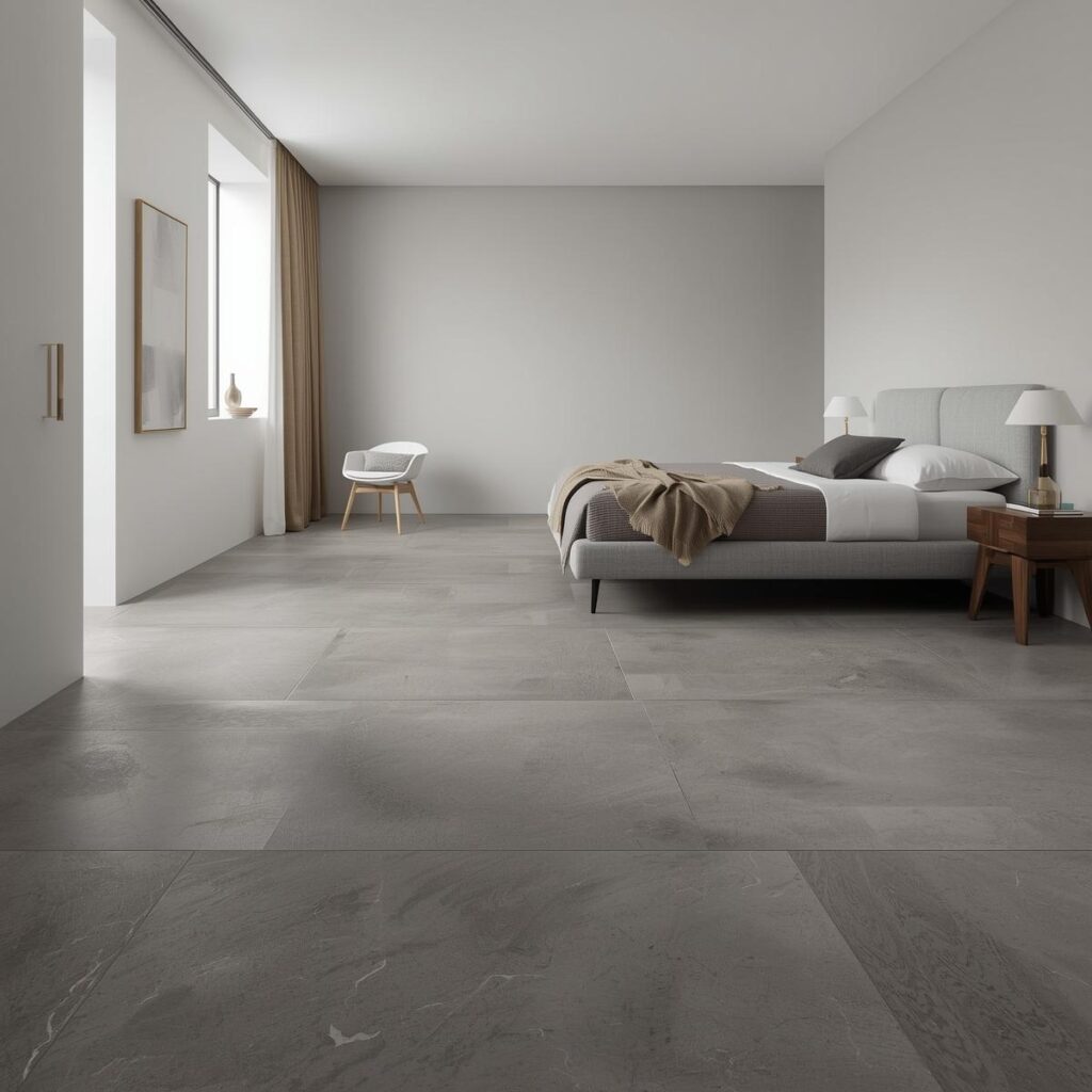 Otra de las grandes apuestas entre los mejores suelos en 2025 son los tonos grises en gran formato. El gris continúa siendo un color estrella en interiorismo, ya que transmite modernidad, sobriedad y neutralidad.