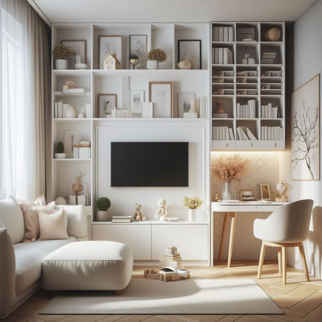 Opta por un sofá cama y mesas de centro elevables. Añade estanterías modulares que puedan cambiarse según tus necesidades.