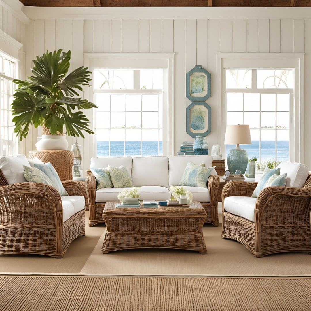 Yute y ratán: Estos materiales naturales son muy utilizados en el estilo costero. Añaden textura y calidez. Los puedes usar en sillas, sillones, cestos, mesas, alfombras y todo tipo de decoraciones para dar ese toque hogareño a la estancia.
