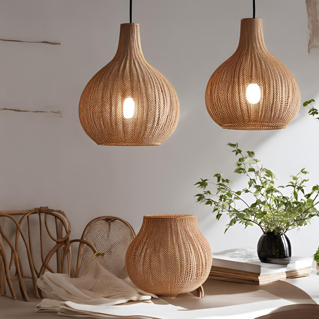 • Lámparas colgantes: Este tipo de lámparas, las puedes poner sobre mesas de comedor o islas de cocina para conseguir una iluminación más focalizada. Pueden tener forma de faros o de pantallas de mimbre o ratán para aportar textura manteniendo la armonía con la estética.